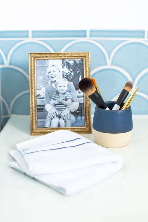 Để tạo điểm nhấn quyến rũ, ấm áp, Henderson chọn các phụ kiện nhà tắm mang màu vàng kim, ánh đầy vẻ kiêu sa. Cô cũng chăm chút đến các phụ kiện nhỏ như: đĩa nhẫn bằng đá marble từ BST Nate Berkus của Target, khung hình ánh vàng, thảm chùi chân và ly để bàn chải được chọn theo tông xanh hải quân (nâng sắc độ để tạo điểm nhấn)