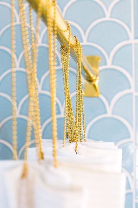 Ngay cả chi tiết nhỏ như trục rèm và móc treo cũng có màu vàng kim kiêu sa, lấp lánh. Sự bổ sung màu sắc này đem đến cảm giác vui thích hơn rất nhiều cho căn phòng tắm phủ đầy màu xanh thanh thản, bình yên.