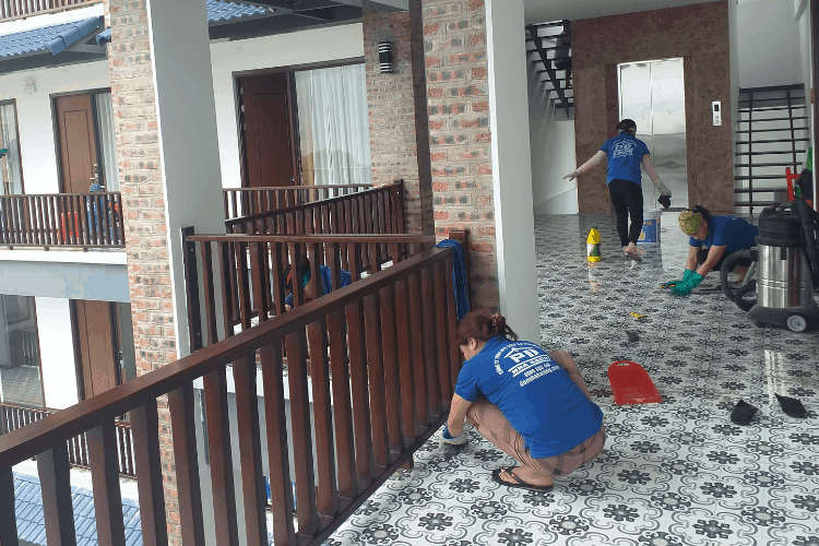 + Sử dụng khăn lau trên sàn nhà. Nên dùng lực chà trên khu vực bề mặt bám dính sơn.