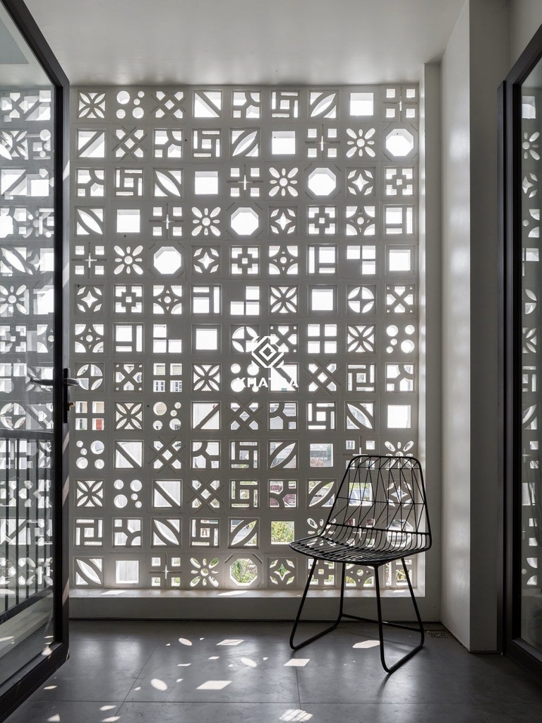 Thay vì bức tường bê tông đơn điệu, gạch thông gió tạo nên các vách ngăn nhẹ nhàng, duyên dáng, phân chia không gian mà không gây bí bách.