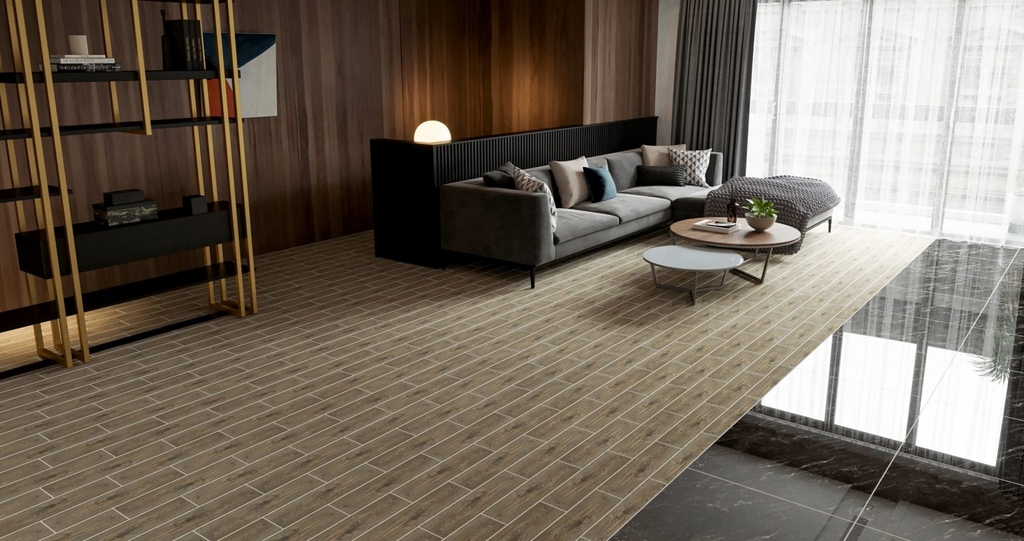 Ở phòng khách, gạch giả gỗ tạo nền tảng cho một không gian tiếp khách ấm cúng và thư giãn.