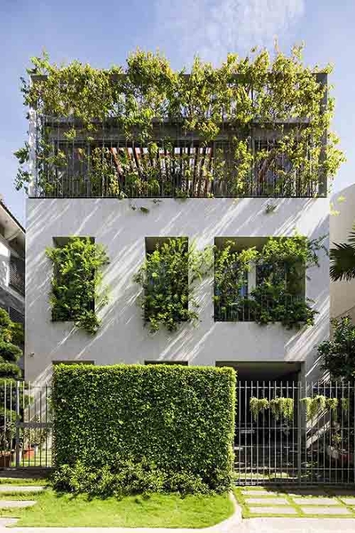 Cây xanh là loại “vật liệu mặt tiền” rất đặc biệt. Chúng kết hợp với nhau tạo thành lá chắn tự nhiên hạn chế bụi bẩn, tiếng ồn, điều chỉnh nhiệt độ và giúp không gian bên trong mát mẻ. Tường cây xanh ở mặt tiền cũng nhanh chóng thu hút sự chú ý bởi vẻ bề ngoài tươi mới, tràn đầy năng lượng. Bạn có thể trồng cây thân leo bám vào tường nhà, làm hệ thống tường xanh thủy canh… toàn phần hoặc bố trí đan xen khéo léo với các loại vật liệu mặt tiền khác.
