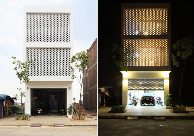 Như chúng ta thấy, mặt tiền của ngôi nhà có thiết kế tổ ong sẽ vô cùng nổi bật, thay vì xây tường kín hoặc cửa sổ, thiết kế này biến cả căn nhà thành một tổ ong lớn với nhiều ô vuông nhỏ cho ánh sáng và không khí lưu thông. Ban đêm, khi nhìn vào, căn nhà trông thật lãng mạn với ánh sáng luồn lách qua các khe vuông, vừa hiện đại, vừa lãng mạn.