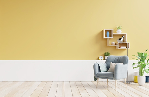 Sơn một bức tường màu vàng để tạo điểm nhấn trong không gian phòng khách hoặc phòng ăn hoặc phối hợp các gam màu trung tính như xám, trắng để tạo sự cân bằng.